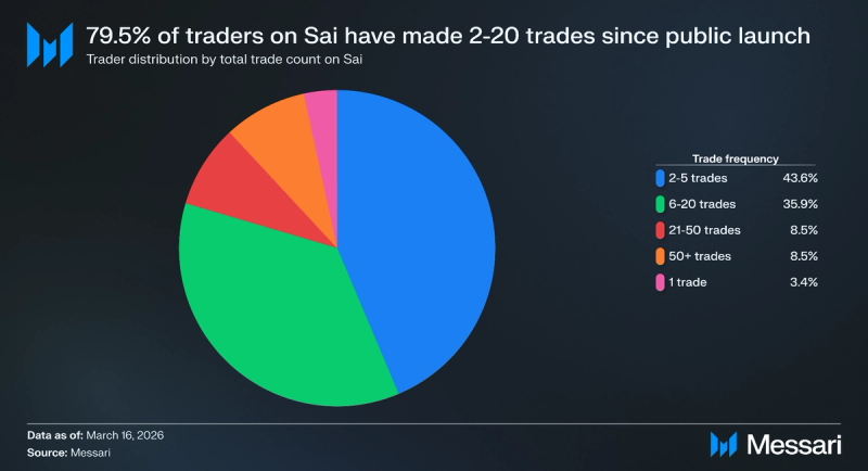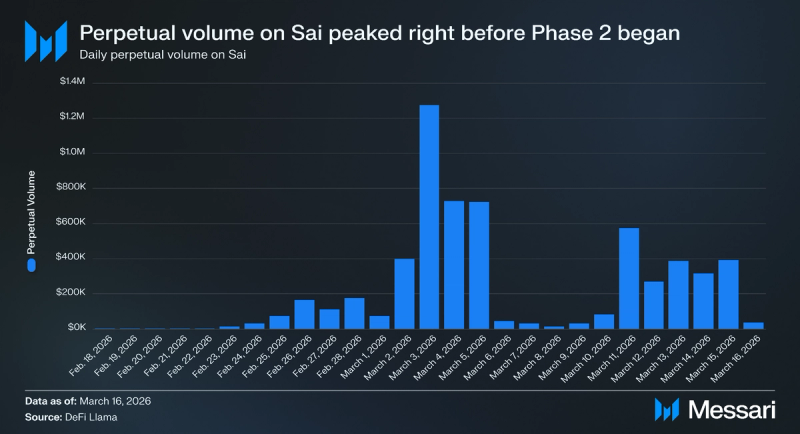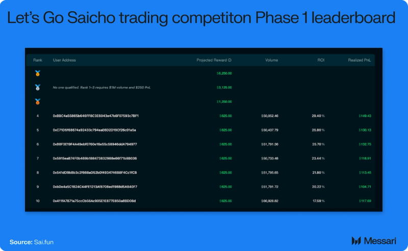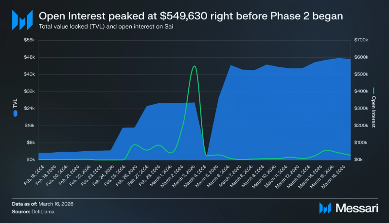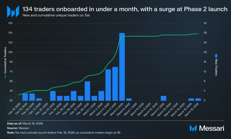 "content": "## Key Insights\n\n* Sai is a perpetual decentralized exchange (perp DEX) built on Nibiru that launched publicly on Feb. 18, 2026. It offers up to 100x leverage with oracle-settled pricing and pools liquidity through Sai Liquidity Positions (SLPs) that back markets and absorb trader P&L.\n* The launch coincided with Let's Go Saicho, a $25,500 trading competition split into two phases. Phase 1 (Feb. 18 to March 4) rewarded the top 25 traders by percentage ROI with up to $20,000, and Phase 2 (March 5 to March 19) distributes $5,500 across volume-based tracks.\n* As of March 16, TVL reached $47,211, cumulative perp volume hit $6 million, and the platform collected $21,560 in fees. Open interest peaked at $549,628 on March 3, the same day volume reached its single-day high of $1.27 million.\n* Sai saw 134 unique traders, with 52.9% executing six or more trades. Returning traders accounted for 58.2% of Phase 2 daily activity. The liquidation rate dropped from 12.9% in Phase 1 to 6.7% in Phase 2 despite average leverage increasing from 33.1x to 44.2x.\n* The roadmap extends beyond perps: a white-label Perps-as-a-Service product, Sai Savings with ~5% yield on idle stables, automated strategy vaults, real-world asset markets, and a mobile application positioning Sai as trading infrastructure rather than an isolated venue.\n\n## Primer\n\n[Sai](https://sai.fun/) is a perpetual decentralized exchange (perp DEX) that aims to simplify, predict, and make leveraged trading more accessible. Users [connect](https://docs.sai.fun/guides/wallet-setup) to the application with standard EVM wallets, deposit collateral such as USDC or stNIBI, and trade perp markets through an interface that resembles a centralized futures exchange. They can open long or short positions, set up to 100x leverage on certain assets, and use familiar order types, including market, limit, stop, and conditional (stop-loss/take-profit) orders.\n\nSai was created by members of the Nibiru team with experience in distributed systems, infrastructure, and financial protocols. The creators are led by Nibiru founder and CEO [Unique Divine](https://www.linkedin.com/in/unique-divine/), who has a background in applied mathematics and machine learning, as well as prior experience at [IBM](https://www.ibm.com/us-en) and [Sommelier Protocol](https://somm.finance/).\n\nSai is built on [Nibiru](https://nibiru.fi/) Chain, a high-throughput Layer-1 with a unified EVM and [Wasm execution](https://nibiru.fi/docs/concepts/wasm/) environment. Nibiru combines an EVM-equivalent runtime ([Nibiru EVM](https://nibiru.fi/docs/evm/)) and a Wasm environment in a single state machine, allowing Solidity and Rust contracts to coexist, share accounts and gas, and call each other through built-in system contracts that bridge the two VMs. Its consensus layer, [Nibiru BFT](https://nibiru.fi/docs/concepts/arch/nibiru-bft/), is an evolution of [CometBFT](https://docs.cometbft.com/v0.38/), delivering fast finality and sub-two-second settlements. Alongside core modules for staking, governance, IBC, and a native oracle, this architecture provides Sai with the low-latency execution, deterministic settlement, and oracle support necessary to offer a CEX-like onchain derivatives platform. Sai’s defining characteristic is its approach to pricing and risk: execution is anchored to decentralized oracles and backed by pooled vaults called Sai Liquidity Positions (SLPs), emphasizing consistent behavior across different market regimes.\n\n## Let’s Go Saicho: The Trading Competition\n\nSai's [public launch](https://x.com/SaiDotFun/status/2024080216474497407?s=20) on Feb. 18, 2026, coincided with the start of [Let's Go Saicho](https://docs.sai.fun/resources/blogs/lets-go-saicho), a one-month trading competition designed to bootstrap both trading activity and platform liquidity. The competition runs through March 19 and distributes a $25,500 prize pool across two phases, each targeting a different type of trader behavior.\n\n### Phase 1: PnL Competition\n\n[Phase 1](https://docs.sai.fun/resources/blogs/lets-go-saicho#phase-1-pnl-competition-feb-18-march-4) ran from Feb. 18, 2026, to March 4, 2026, and allocated $20,000 to the top 25 traders ranked by percentage ROI rather than absolute profit. A trader who earned a 50% return on a $500 account could outrank a trader who earned 5% on a $50,000 account. Only closed positions counted toward PnL, and unrealized gains were excluded.\n\nEligibility thresholds scaled with rank. Traders competing for the top three positions needed at least $1 million in cumulative volume and $250 in profit. Ranks 4 through 10 required $50,000 in volume and $50 in profit, while ranks 11 through 25 required $50,000 in volume with no minimum profit. The prize distribution was structured as follows:\n\n* Rank 1: $6,250\n* Rank 2: $3,125\n* Rank 3: $1,250\n* Rank 4-10: $625 each\n* Ranks 11-25: $250 each\n\n\n\nNo [traders](https://app.sai.fun/leaderboard/) met the $1 million volume threshold required for the top three positions, so none of the top three prizes were distributed. The remaining prizes were awarded to qualifying traders in ranks 4 through 25.\n\n### Phase 2: Volume Competition\n\n[Phase 2](https://docs.sai.fun/resources/blogs/lets-go-saicho#phase-2-volume-based-march-5-march-19-live-now) ran from March 5, 2026, to March 19, 2026, and shifted the incentive from profitability to volume, distributing $5,500 across three tracks. The largest pool, $4,000, is shared among all traders who cross $50,000 in volume, with each trader's share proportional to their total volume. All activity from Phase 1 counts toward Phase 2 thresholds in this segment. A $1,000 pool is split evenly among the first 50 traders to reach $10,000 in Phase 2 volume, creating an early-mover incentive. A single $500 prize goes to the highest-volume trader in Phase 2.\n\nUnlike Phase 1, Phase 2 did not require profitability to qualify. The competition enforces rules against 