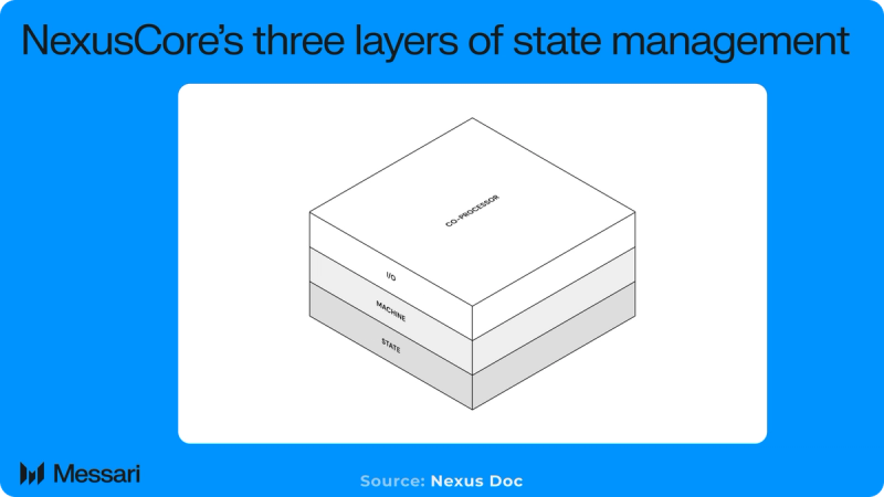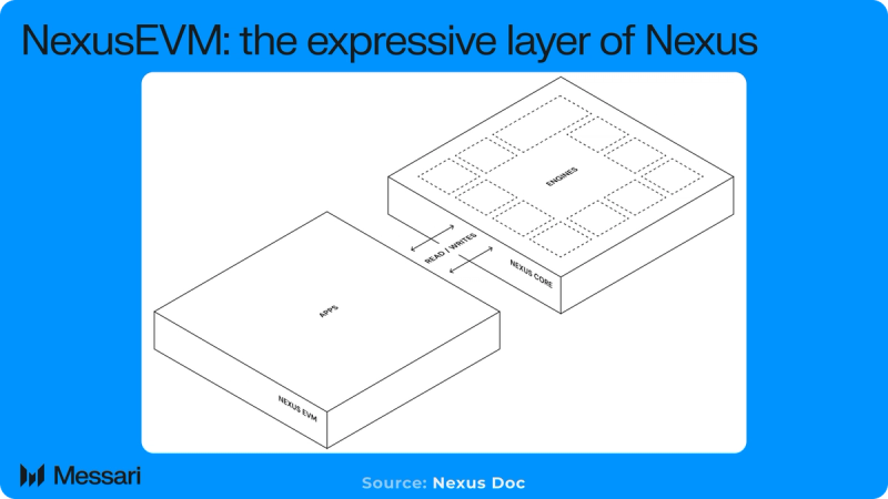 "content": "## Key Insights\n\n* Nexus embeds **high-performance financial engines directly into the protocol through its co-processor model**, moving exchange, margin, and liquidation logic from contract-level simulation into native execution.\n* The **dual-execution architecture allows performance-critical financial workloads and programmable smart contracts to operate in parallel**, avoiding the typical tradeoff between latency and composability.\n* **The Nexus zkVM anchors execution to cryptographic proofs** rather than full validator re-execution, positioning **proof verification as the primary mechanism for scalable correctness.**\n* **With mainnet and exchange deployment in 2026**, Nexus shifts from infrastructure buildout to market validation, where **liquidity formation, and proof-generation efficiency will determine long-term viability. Central to achieving market validation are USDX, the native U.S. dollar stablecoin of the Nexus ecosystem, and the Nexus Exchange, a non-custodial, central limit order book (CLOB) embedded directly into the Nexus Layer 1 (L1).**\n* **The Nexus Exchange is designed to deliver CEX-parity performance in a more self-custodial, verifiable environment that can host and leverage high-frequency trading strategies, AI agents, commerce, and other economic activity.**\n\n## Introduction\n\nFinancial infrastructure depends on complex computational systems that remain largely unverifiable to external participants. Risk models, margin calculations, settlement logic, and internal reconciliation processes operate behind institutional boundaries, requiring users to rely on reporting and oversight rather than direct proof. While public blockchains introduced deterministic execution and transparent state transitions, most existing architectures are not designed to support the performance and computational demands of modern financial markets.\n\nGeneral-purpose chains prioritize composability and shared liquidity but face constraints around latency and throughput. [Application-specific chains](https://messari.io/copilot/share/application-specific-chains-d7e77c8d-2068-4560-84a1-c23e800490dc) achieve higher performance by narrowing scope, yet fragment liquidity and isolate execution environments. In both cases, critical financial logic often remains either offchain or insufficiently optimized for high-frequency, computation-heavy workloads.\n\n[Nexus](https://messari.io/project/nexus-labs) introduces a layered architecture that separates execution, verification, and consensus into independently optimized systems. Its [dual execution model](https://docs.nexus.xyz/architecture/dual-block-execution) combines an [EVM-compatible environment](https://messari.io/copilot/share/evm-compatibility-df970104-0577-49f5-a15e-647f9e746f32) with a specialized financial [co-processor](https://messari.io/copilot/share/co-processor-definition-6dd4fd0e-6438-4882-8403-5fa2234b1ae2), while a native [zkVM](https://messari.io/copilot/share/zkvm-explained-81e8af21-442d-44b7-9201-1a191baf51ef) generates proofs of correct execution that are committed to the base layer. This structure is designed to support performance-sensitive financial applications without relying on external verification frameworks. For example, the [upcoming](https://blog.nexus.xyz/introducing-the-nexus-dex-alpha/) [Nexus ](https://app.nexus.xyz/trade)Exchange is designed to deliver CEX-parity performance in a more decentralized environment that can host and leverage high-frequency trading strategies, AI agents, commerce, and other economic activity.\n\nThis Initiation of Coverage (IOC) report focuses on a technical examination of Nexus’s architecture. Readers seeking a broader discussion of the long-term vision behind verifiable finance are encouraged to refer to the [Nexus Pulse Report](https://messari.io/report/nexus-a-framework-for-verifiable-finance).\n\n[Website](https://nexus.xyz/) / [X (Twitter)](https://x.com/NexusLabs) / [Discord](https://discord.com/invite/AmRKShJfq6)\n\n## Background\n\n[Nexus](https://messari.io/project/nexus-labs/fundraising) was founded in 2022 by [Daniel Marin](https://www.linkedin.com/in/danielmarinq/), a computer science graduate from Stanford University, with the objective of building a universal verifiable machine capable of proving arbitrary computation. The project initially focused on advancing zero-knowledge (zk) proving infrastructure before refining its scope toward financial applications that demand both high performance and computational integrity.\n\nIn June 2024, Nexus [raised](https://blog.nexus.xyz/series-a/) a $25 million Series A round co-led by [Lightspeed](https://messari.io/organization/lightspeed-venture-partners) and [Pantera](https://messari.io/organization/pantera-capital), bringing total capital raised to over $27 million. The network [launched](https://blog.nexus.xyz/the-new-nexus-testnet-is-live/) its first public testnet in December 2024 and has since iterated toward a production-ready architecture.\n\n## Technology\n\n\n\nNexus is structured as a [three-layer architecture](https://docs.nexus.xyz/) composed of an Execution Layer, a Verification Layer, and a Consensus Layer. Each layer operates as a distinct system, responsible for running application logic, generating and validating execution proofs, and finalizing state transitions.\n\n### Execution Layer: Nexus EVM and NexusCore\n\n#### Dual-Block Execution\n\nNexus implements a [dual-block execution model](https://docs.nexus.xyz/architecture/dual-block-execution) designed to separate high-frequency financial processing from general-purpose smart contract coordination. Instead of batching all activity into a single block cadence, the network operates two synchronized block streams with distinct performance characteristics.\n\n[NexusCore](https://docs.nexus.xyz/architecture/nexuscore) targets block times of five milliseconds, while NexusEVM has a block time of 1-2 seconds. These blocks are optimized for latenc