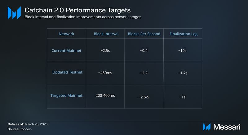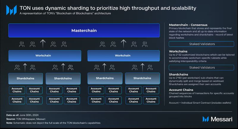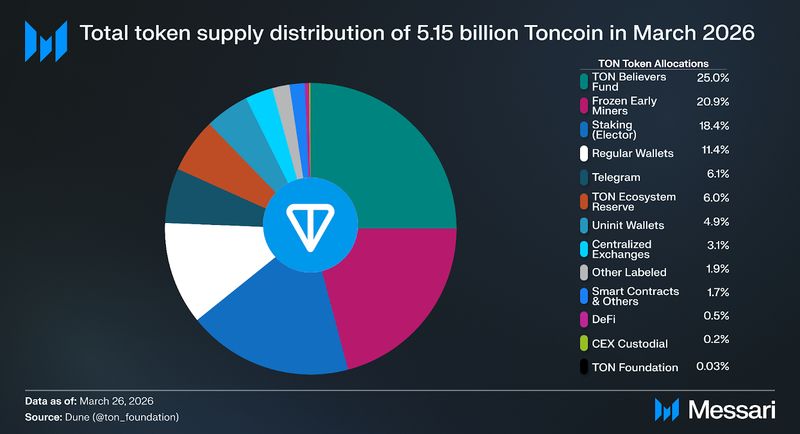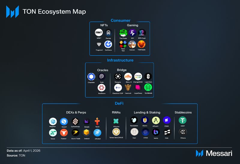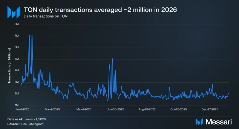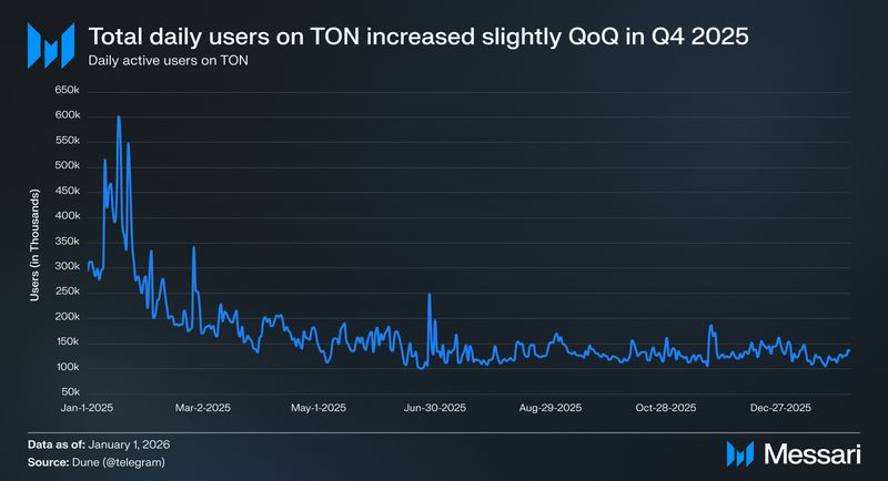 "content": "## **Key Insights**\n\n* **Toncoin (TON) functions as the network’s core execution asset (i.e., paying gas, supporting DeFi liquidity, securing Proof-of-Stake consensus, and acting as a settlement layer)** and as the foundation of Telegram's in-app economy.\n* **2025 activity shows TON shifting from early-year viral surges into a steadier baseline** (~100K–150K daily active users and ~1.5–2.5 million daily transactions).\n* **TON’s ecosystem** is evolving into a Telegram-native financial stack, with stablecoins, yield products, and RWAs increasingly embedded in wallets and mini-apps; **highlighted by xStocks, Ethena, Tether, Affluent, and liquidity routing via STON.fi + Omniston.**\n* **TON's 2026 roadmap pivots from infrastructure refactoring to performance and developer accessibility**. Catchain 2.0 targets sub-second finality, the Rust Node reimplements the validator stack, and a unified developer layer that includes developer kits for smart contracts, apps, wallets and payments.\n* **TON is emerging as a native infrastructure layer for AI** inside Telegram, with Cocoon providing decentralized compute, AgentKit connecting autonomous agents to onchain actions, and vibe-coding workflows enabling builders to quickly generate and share working prototypes.\n\n## **Introduction**\n\nConsumer crypto adoption typically breaks down into two bottlenecks: distribution and cost/latency. Most blockchains rely on standalone wallets and browser-based dApps, creating multi-step onboarding funnels that deter mainstream users. Even when infrastructure works, blockchain interactions often feel slow, expensive, or fragmented compared to Web2 applications; particularly in consumer use cases like payments, gaming, and social applications, where users expect instant feedback and low friction.\n\nTON’s thesis is that mass adoption requires both scalable infrastructure and native distribution. At the base layer, TON is built as a dynamically sharded Proof-of-Stake (PoS) network with asynchronous smart contracts, allowing parallel execution and horizontal scalability. Rather than relying solely on high single-chain throughput, TON’s architecture is designed to maintain stable performance under load. Complementing the Layer-1 are native protocol services, including (i) [TON DNS](https://dns.ton.org/) (human-readable “.ton” names), (ii) [TON Storage](https://docs.ton.org/foundations/services#ton-storage) (decentralized file storage), (iii) [TON Payments](https://docs.ton.org/foundations/services#ton-payments) (payment channels), (iv) [TON Proxy](https://docs.ton.org/foundations/services#ton-proxy) (censorship-resistant routing), (v) [TON Sites ](https://ton.org/en/ton-sites)(decentralized websites), and (vi) [Tolk](https://docs.ton.org/languages/tolk/overview#tolk-language) (smart contract language), and (vii) [AppKit](https://docs.ton.org/ecosystem/appkit/overview) (an all-in-one SDK for building Telegram Mini Apps with TON), which together form a vertically integrated blockchain stack with easy developer tooling.\n\nWhat differentiates TON is its distribution and tight integration with [Telegram](https://telegram.org/). [**TON Wallet**](https://wallet.tg/ton), natively embedded in the messenger, allows users to transact onchain without leaving the app. [**TON Connect**](https://docs.ton.org/ecosystem/ton-connect/overview), the wallet-connection protocol for **Telegram Mini Apps (TMAs)**, opens this to any compatible third-party wallet, though TON Wallet remains unique as Telegram's built-in wallet. Combined with in-chat app distribution, the result is onchain actions that feel like normal in-app behaviour, collapsing the traditional crypto UX stack into a single consumer environment.\n\n[Website](https://ton.org/en) / [X (Twitter)](https://x.com/ton_blockchain) / [LinkedIn](https://www.linkedin.com/company/ton-blockchain)\n\n\n\n## **Background**\n\nTON was founded in 2018 as the “Telegram Open Network” by Telegram co-founders [Pavel Durov ](https://x.com/durov?lang=en)and [Nikolai Durov](https://x.com/Kolja_Durov?lang=en), and raised $1.7 billion across two private token sales in February–March 2018 to fund development. In October 2019, [the](https://aurum.law/newsroom/telegram-ton-1-7-bill-raise-sec-decentralization-the-legal-tale-and-insights) U.S. Securities and Exchange Commission (SEC) filed an emergency action against Telegram alleging an unregistered token offering, and Telegram ultimately ceased active involvement in May 2020. Development continued through the community-led “Newton” effort initiated by [Anatoliy Makosov](https://x.com/anatoly_makosov) and Kirill Emelyanenko, and in May 2021, the community voted to formalize governance under the TON Foundation and promote the V2 testnet into TON Mainnet.\n\nFollowing the community relaunch, TON attracted additional strategic and private investment. Since 2022, TON has [completed](https://messari.io/project/the-open-network/fundraising/funding) eight additional funding rounds, with at least three publicly disclosed raises totaling $50 million ($10 million from [DWF Labs](https://messari.io/organization/dwf-labs) in 2022, $30 million in a private sale backed by Foresight Ventures and Bitget in 2024, and $10 million in a strategic investment from [Gate](https://messari.io/organization/gate-io) in 2024).\n\nSince 2022, TON has attracted significant institutional backing. In [March 2025](https://www.tradingview.com/news/cointelegraph:d27a07a06094b:0-venture-capital-firms-invest-400m-in-ton-blockchain/), the TON Foundation disclosed that a group of investors, including Sequoia Capital, Pantera Capital, and Ribbit Capital, collectively purchased over $400 million in Toncoin. Combined with earlier rounds and subsequent investments from Coinbase Ventures, Pantera Capital, and others, publicly confirmed capital inflows exceed $550 million. Later in [August 2025](https://cryptoslate.com/verb-secures-558m-to-become-first-ton-t