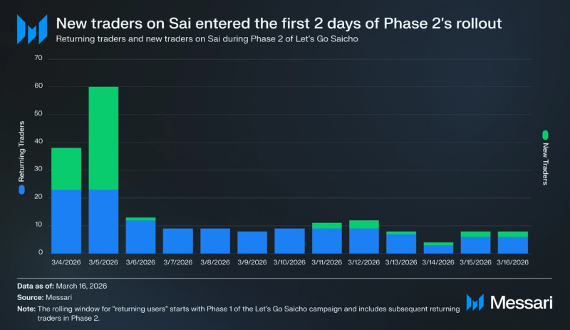 "summary": "Sai is a perpetual DEX on Nibiru offering up to 100x leverage with oracle-settled pricing and pooled SLP-backed liquidity. Its public launch coincided with Let's Go Saicho, a $25,500 competition split between a PnL phase and a volume phase, each targeting different trader behavior. TVL grew 14x to $47,210, cumulative fees hit $21,560, and returning traders accounted for 58.2% of Phase 2 daily activity. The effective fee rate diverged sharply between phases, from 0.64% in Phase 1 to 0.07% in Phase 2, reflecting a shift from high-conviction directional bets to smaller, higher-leverage volume plays. Sai's roadmap extends into Perps-as-a-Service, yield products, RWA markets, and a mobile app, positioning it as trading infrastructure rather than an isolated venue.",